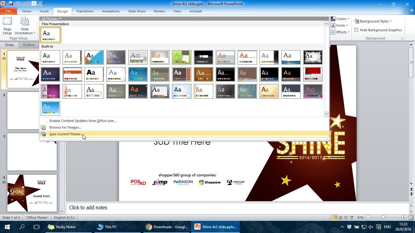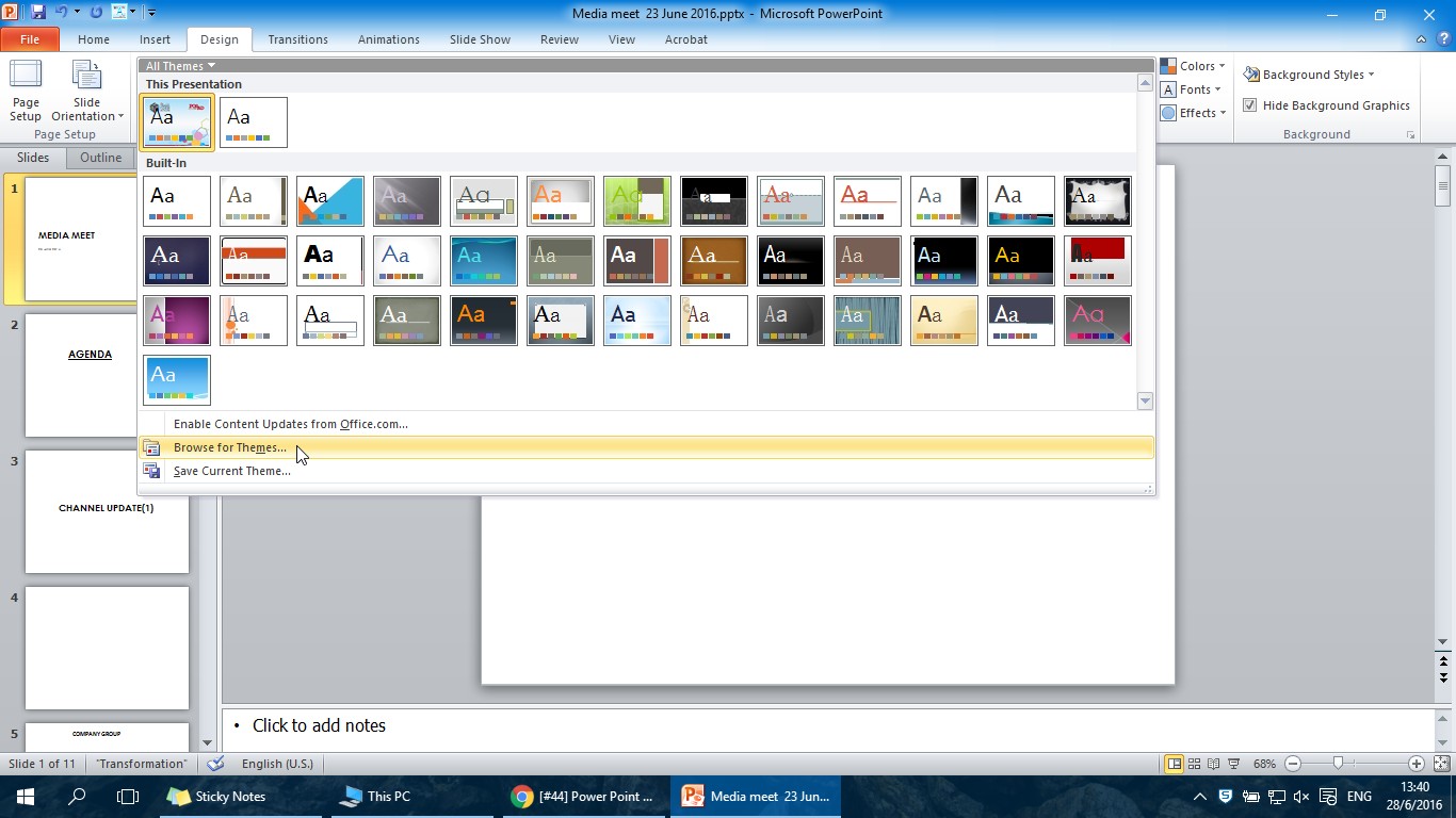 5. Go to tab "Design" and click "Browse for Themes" . Select the theme u save at step 1.